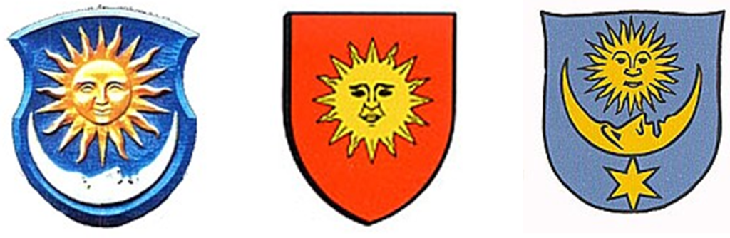 Jetzt das Gaupt: Ich lehne es kategorisch ab zu glauben, dass die Sonne auf dem Wappen in Form eines sechseckigen Sterns dargestellt werden könnte. In der mittelalterlichen Heraldik wurde es üblich, die Sonne auf Wappen so zu malen, wie es Kinder jetzt tun: in Form eines Kreises mit vielen Strahlen. Auserdem gab es auch ein lustiges Gesicht im Kreis. Nehmen wir an, dass die Geschichte mit dem Bischof tatsächlich geschehen würde und die Bewohner von Halle Himmelskörper auf dem Wappen der Stadt darstellen würden. Dann würde die Sonne darauf so aussehen, wie auf den alten deutschen Wappen. Das Wappen von Halle würde sich nicht von dem Wappen von Hurley aus Bern unterscheiden .