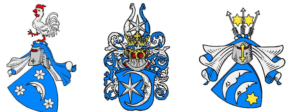 Der halleschen Historiker Johann Dreihaupt (1699 -1768), der selbst Salzgraf war, hat uns eine Liste aller Salzgrafen, die eine Lücke von 1179 bis 1285 enthält, hinterlassen. Gerade zu dieser Zeit konnte mein Held dem Salzgrafen sein. Als indirekter Beweis für die fünfte Version bringe ich die Wappen der deutschen Ritter aus berühmtem „Buch der deutschen Wappen“ von Johann Siebmacher (1596). Auf diesen Wappen sehen wir Bilder von Sternen und Halbmondbildern sowie Zeugen der Beteiligung der Besitzer dieser Wappen an Kreuzzügen – das Tuch auf Ritterhelmen.