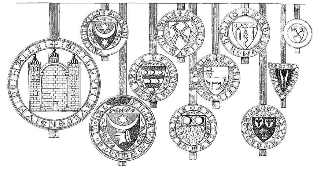 Jetzt schauen wir uns das erste Bild des Halles-Wappens von 1327 an, von dem uns Wikipedia berichtet. Im 1. Band „Geschichte der Stadt Halle“ 2006 konnte ich ein Foto und eine Beschreibung des Dokuments finden, auf das sich Wikipedia bezieht.
