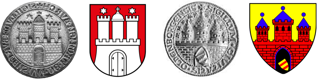 1) das Hansewappen; 2) das Wappen der Hansestadt Hamburg;